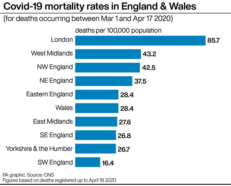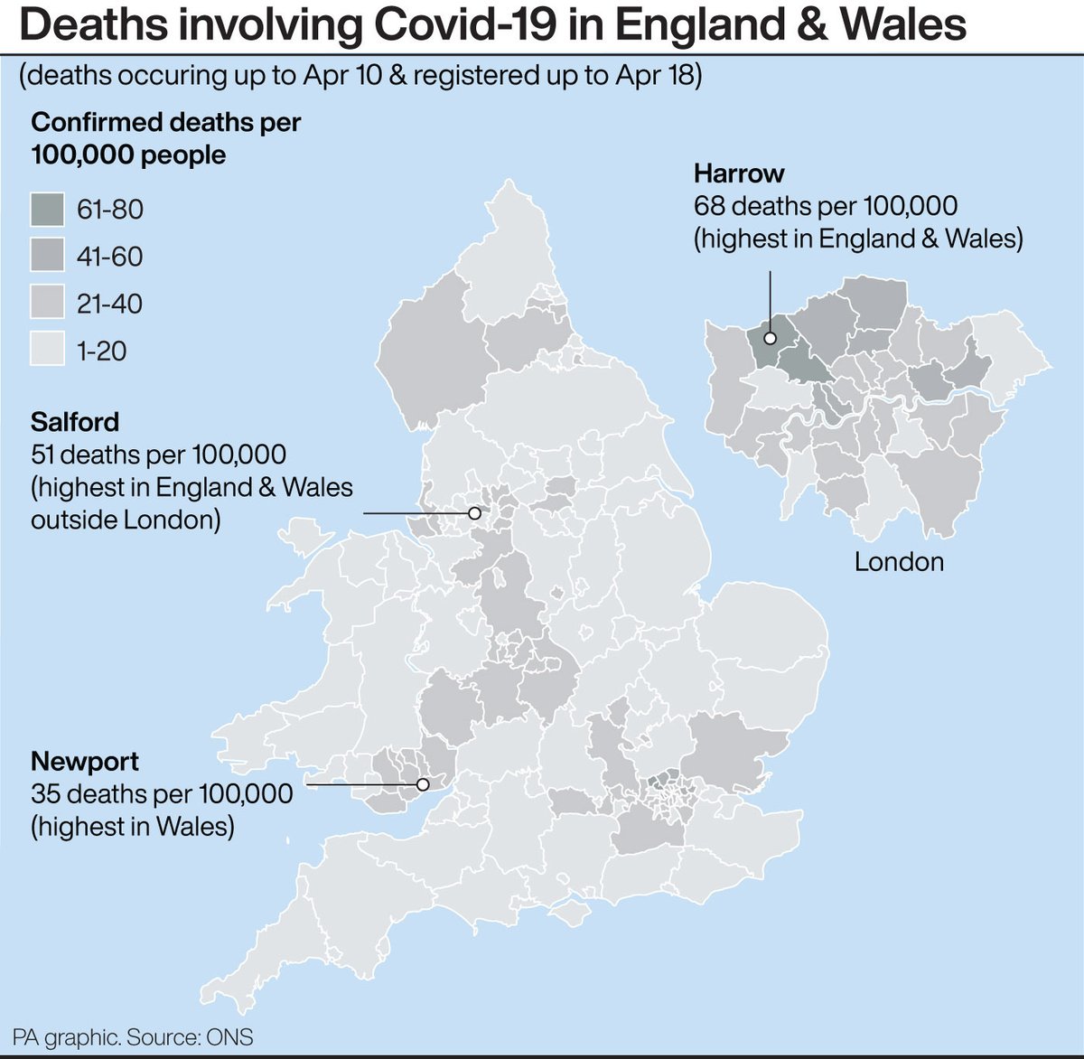 273 deaths per 100000. Figures also show 14 communities with no covid 19 deaths registered at all. The local authorities with the highest age standardised mortality rates for deaths involving covid 19 were all london boroughs. Newham had the highest age standardised rate with 1443 deaths per 100000 population followed by brent with a rate of 1415 deaths per 100000 population and hackney with a rate of 1274 deaths per 100000 population.